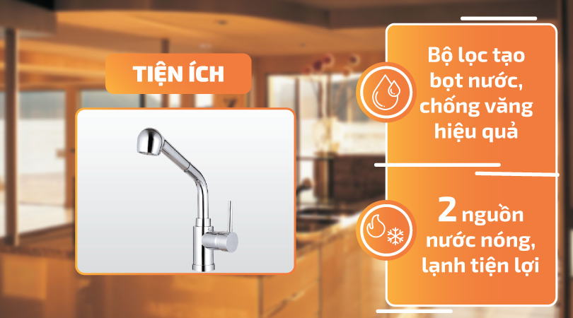 Ngoài việc được trang bị 2 nguồn nước nóng, lạnh cùng cơ chế tạo bọt, chống văng nước tiện lợi, vòi rửa còn mang vẻ đẹp thiết kế tinh tế, hiện đại cho gian bếp.