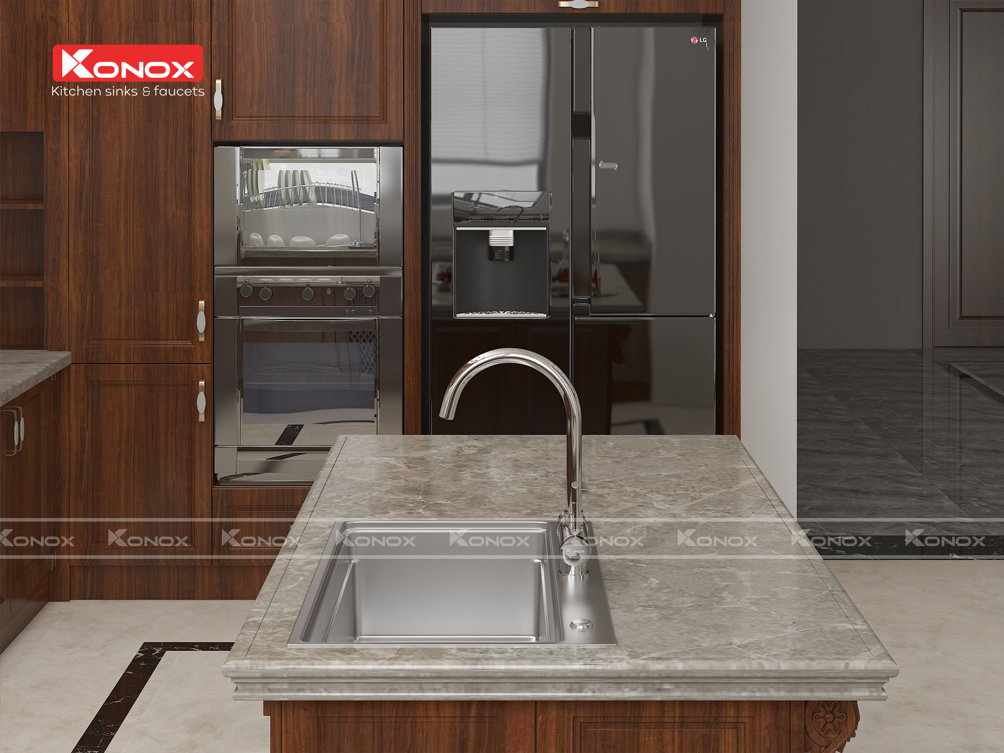- Vòi rửa bát 3 đường nước: 2 đường nóng lạnh + 1 đường kết nối với máy lọc nước uống RO