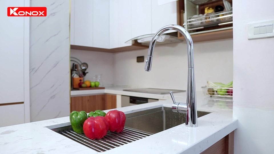 - Tay vòi ngang tối ưu không gian bàn bếp