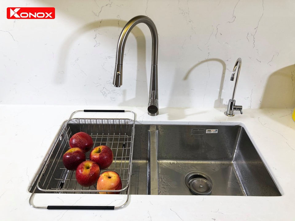 - Bề mặt vòi rửa Konox KN1901N mạ sáng bóng bền lâu, chống bám vân tay với công nghệ mạ PVD Chrome 5 lớp