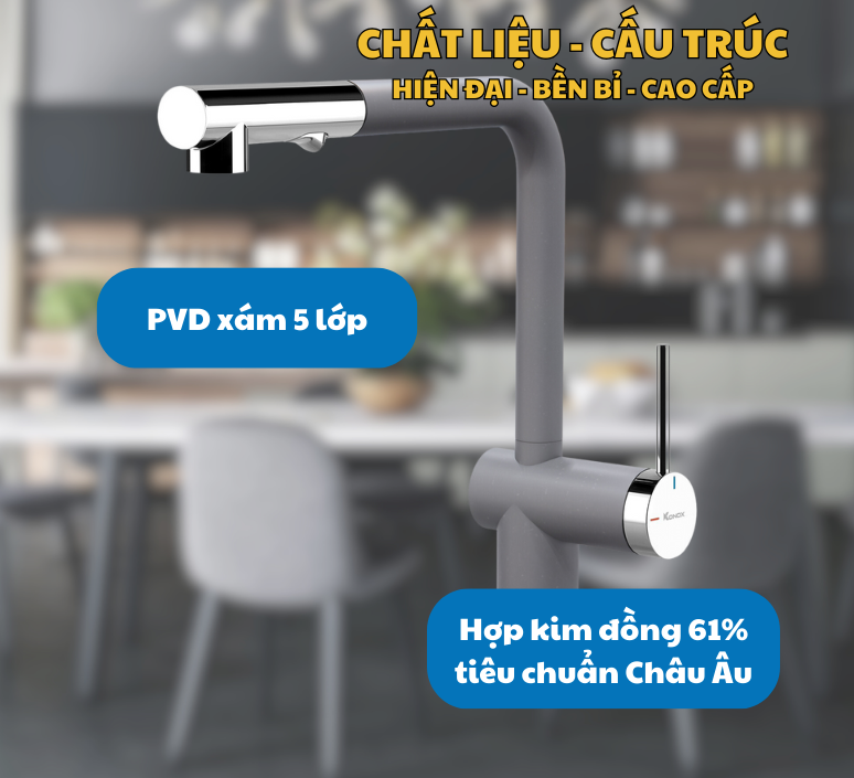 - Bề mặt PVD Xám 5 lớp: Chống trầy xước, chống bám bẩn, giữ cho vòi luôn sáng bóng như mới.