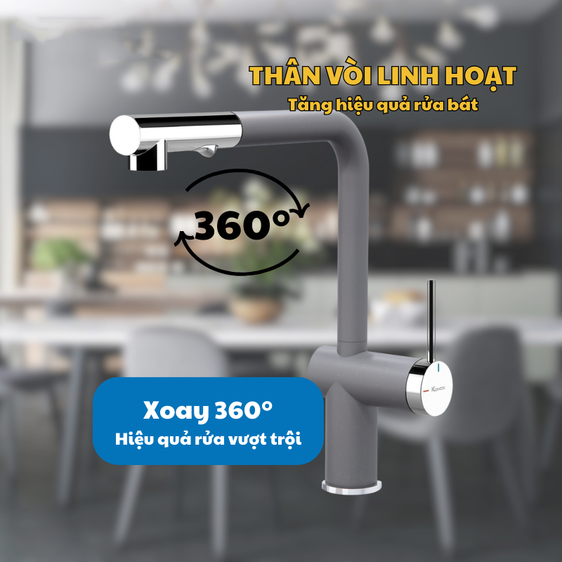 Konox Stella Grey sở hữu thiết kế bo tròn mềm mại, tay vòi ngang thanh lịch, mang đến vẻ đẹp hiện đại và tinh tế cho không gian bếp. Thân vòi có khả năng xoay 360 độ linh hoạt, giúp bạn dễ dàng điều chỉnh hướng nước đến mọi vị trí trong bồn rửa.