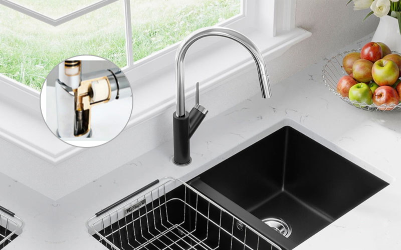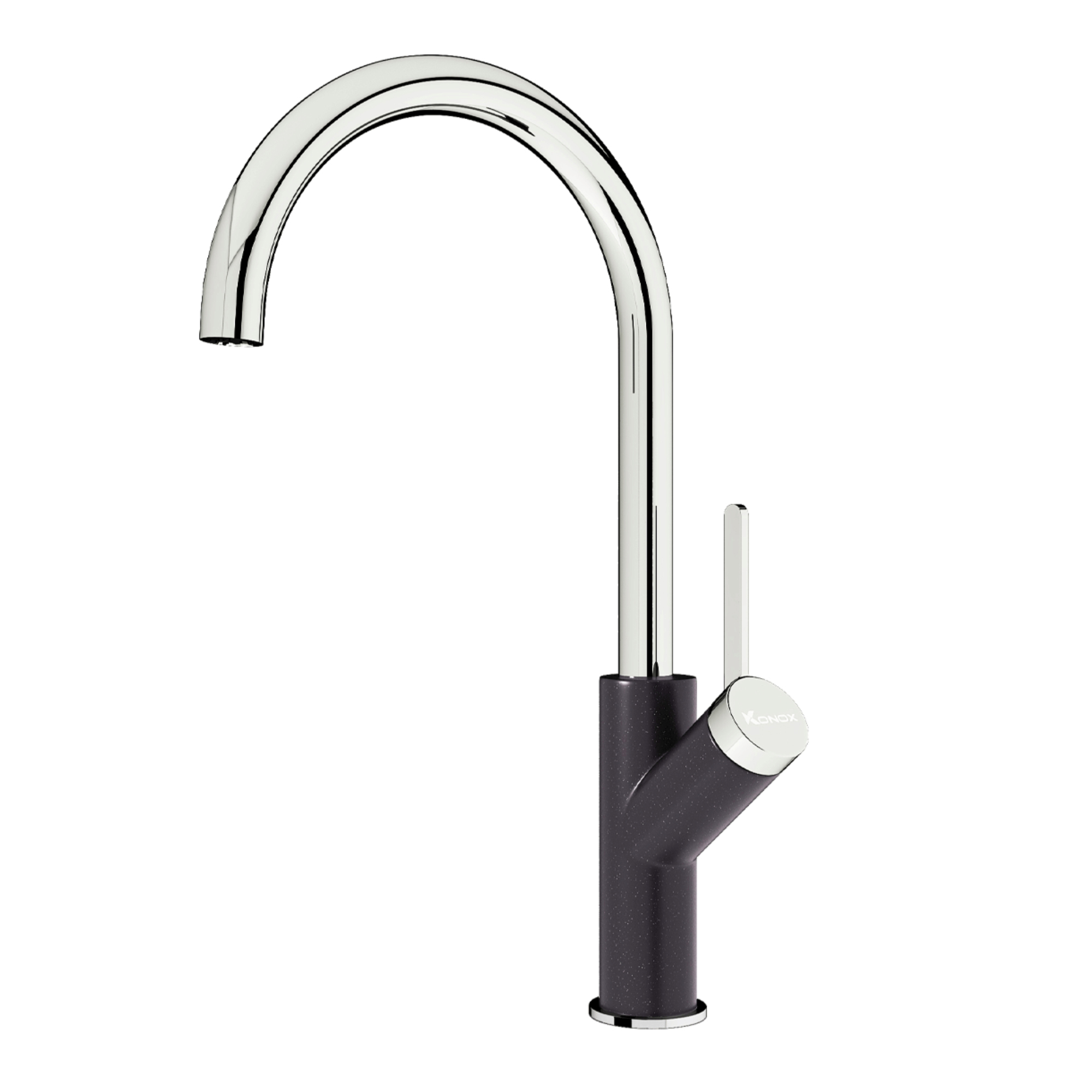 - Bề mặt vòi rửa Konox Modo Black mạ sáng bóng bền lâu, chống bám vân tay với công nghệ mạ PVD mạ vân đá