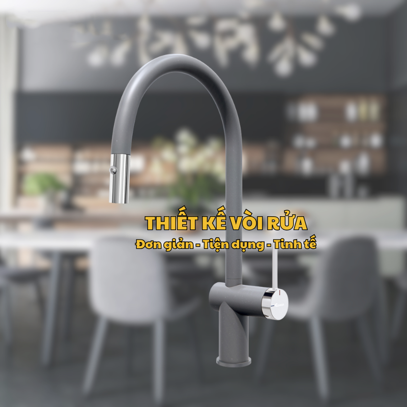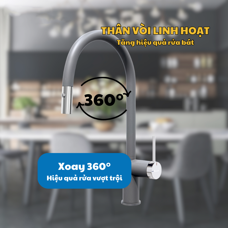 Konox Resta Grey gây ấn tượng ngay từ cái nhìn đầu tiên với thiết kế bo tròn mềm mại, uyển chuyển. Tay vòi ngang hiện đại, dễ dàng thao tác. Thân vòi xoay 360 độ linh hoạt, cho phép bạn dễ dàng điều chỉnh hướng nước đến mọi vị trí trong bồn rửa, tăng tính tiện dụng và hiệu quả làm sạch.