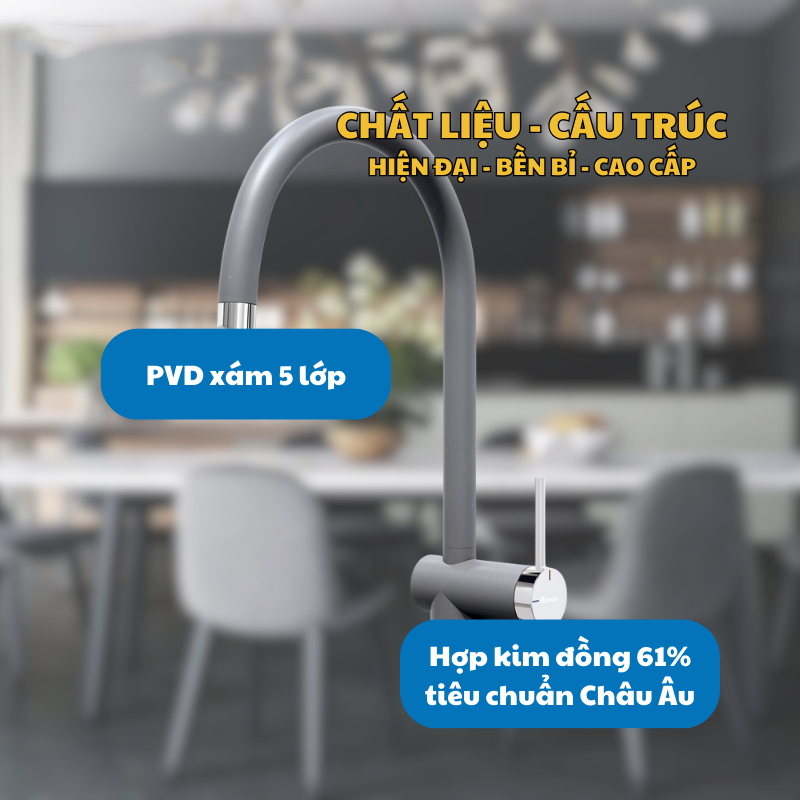 - Bề mặt PVD Grey 5 lớp: Lớp hoàn thiện màu xám sang trọng, bền bỉ với thời gian, chống trầy xước, bám bẩn và dễ dàng vệ sinh.