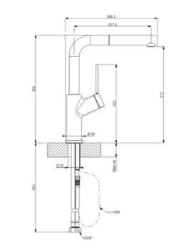 Kích thước lỗ khoét của vòi rửa bát F400420CR: đường kính 35mm và chiều cao từ mặt chậu đến thân vòi là 305mm.